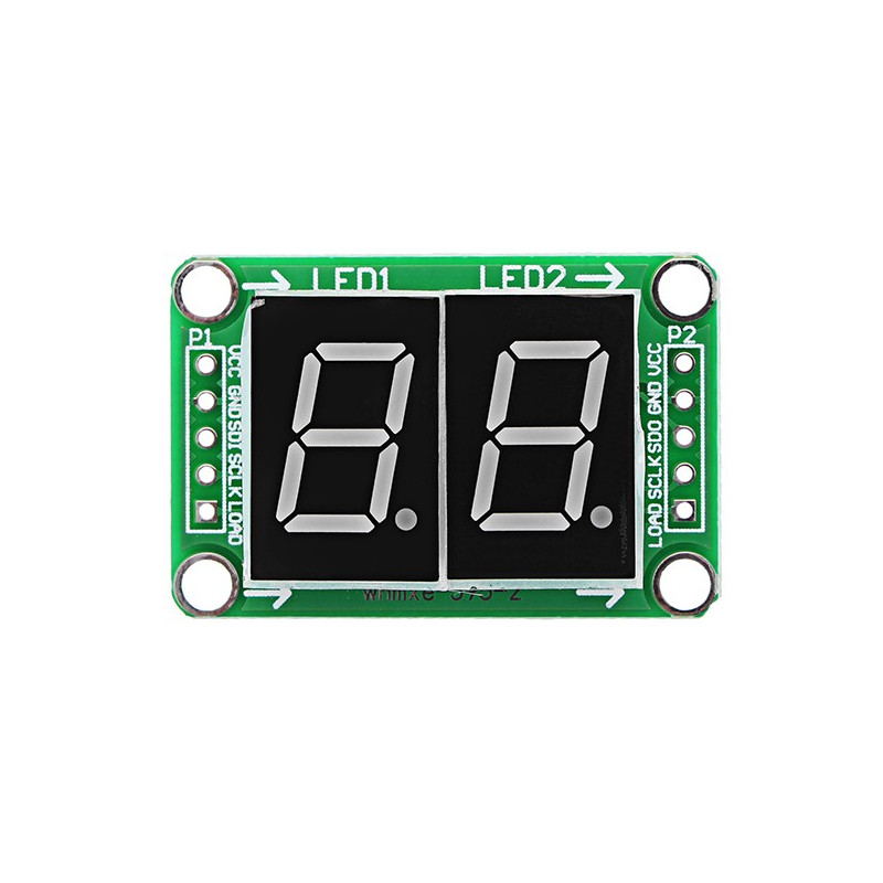 Модуль двухсимвольного дисплея наделён входом P1 и выходом P2. Ко входу P1 может быть подключен управляющий контроллер, если в разрабатываемом проекте задействован один дисплей. Либо к выходу идентичных модулей с двумя, тремя или четырьмя индикаторами, если таких дисплеев два и более. Выход Р2 — для дополнительно присоединяемых в схему модулей. Все контакты на входе и выходе платы запараллелены с их прямым назначением, за исключением последовательного входа первого регистра SDI и последовательного выхода второго регистра SDO.
