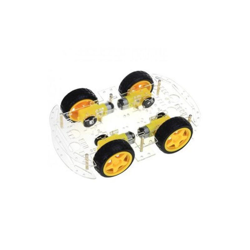 В комплект входит: 2 пластиковые пластины 4 колеса 4 мотора с редуктором 4 диска с прорезями для датчика вращения Латунные стойки и крепеж 4 металлических уголка Отвертка для сборки Проводки Батарейний отсек на 4 батарейки АА
