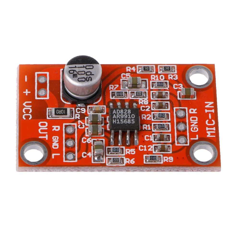 Операционный усилитель AD828 — хороший выбор для усиления звука, звучит очень хорошо. Усиление до 80 дБ и до 100 МГц. Способен обеспечить 2 В амплитуды даже на нагрузке 10 Ом. Без искажений выдаёт в нагрузку до 50 мА тока. Уровень гармоник при КУ=2 плавно стремится к -100 дБ, а это отличный результат. Малошумен и обладает хорошим подавлением пульсаций, скорость нарастания 450 В/мкс.