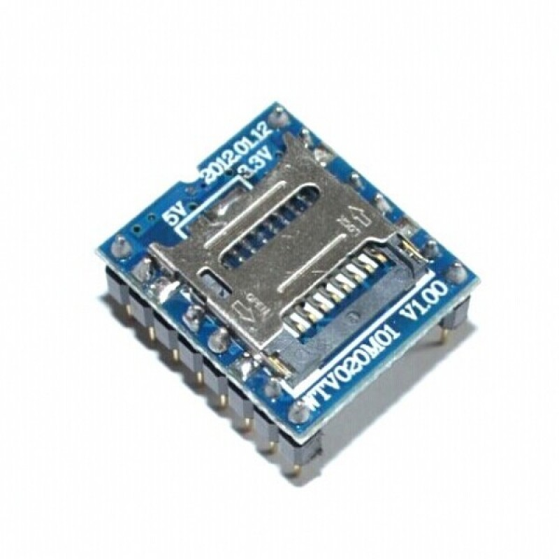 WTV020M01 - это компактный звуковой модуль для воспроизведения аудиофайлов с флеш-карт формата microSD. Модуль содержит контейнер для установки карты памяти. Замена воспроизводимого файла производится сменой или перезаписью SD-карты. Карта должна иметь файловую систему FAT 16.