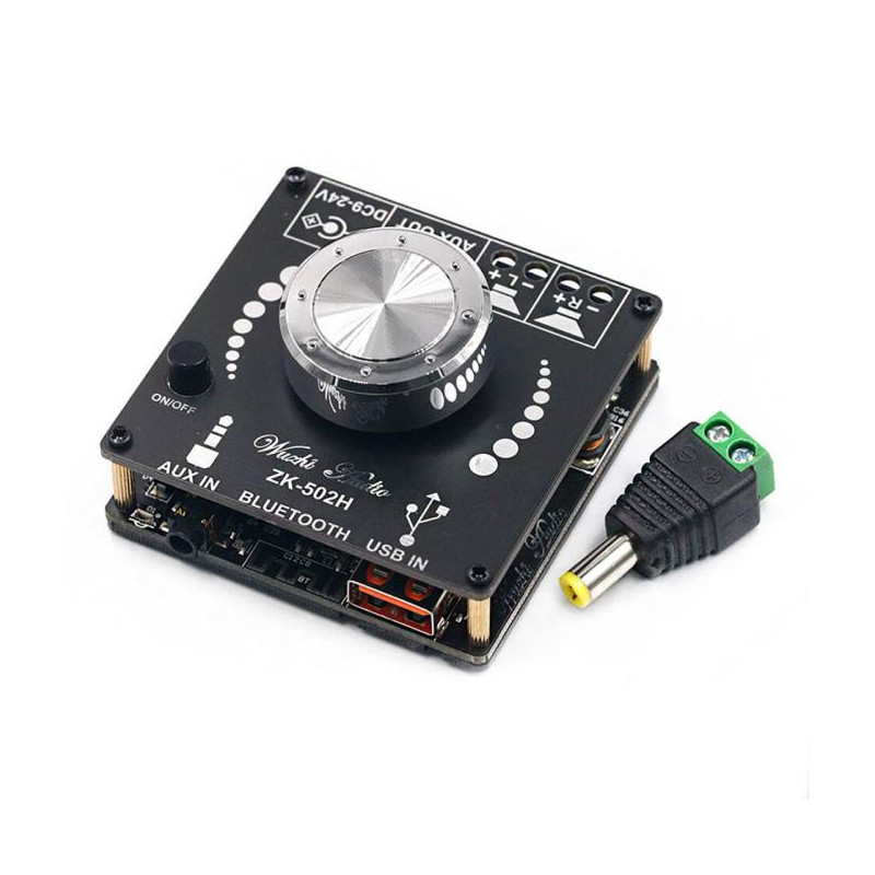 Стерео аудио усилитель ZK-502H D-класса на микросхеме TPA3116 мощностью 2x50Вт. Оснащен Bluetooth V5.0 модулем.